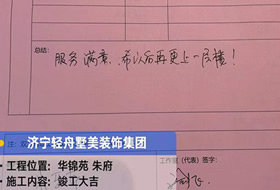 貴府的工程已全部圓滿竣工并通過了竣工驗收,感謝您在整個過程中對于我們的理解、支持和包容。輕舟美住裝飾王洪綱工作室提前恭賀您和家人喬遷新居,恭祝您和家人生活幸福美滿、事業(yè)蒸蒸日上。